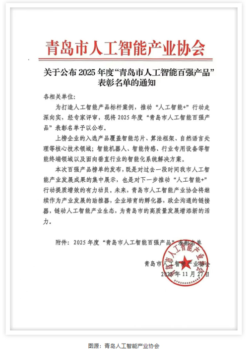 Recently, the Qingdao Artificial Intelligence Industry Association officially announced the recipients of the “2025 Qingdao Top 100 Artificial Intelligence Products” awards.